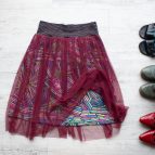 Spodní sukně z prémiové bavlněné látky – příjemné bavlněné plátno pod závojem z vínového tylu. Střih do „A“ kopíruje boky, nepřidává tak na objemu, zatímco lehounký splývavý tyl se navrch vlní kolem vašich boků. V pružném pase je všita jemná guma, díky ní pas hezky přilne, nebude se vytahovat.