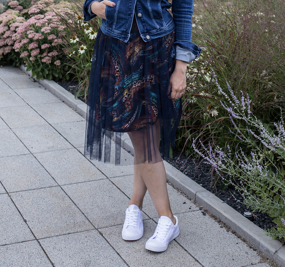Střih do „A“ kopíruje boky, nepřidává tak na objemu, zatímco lehounký splývavý tyl se navrch vlní kolem vašich boků. V pružném pase je všita jemná guma, díky ní pas hezky přilne, nebude se vytahovat.